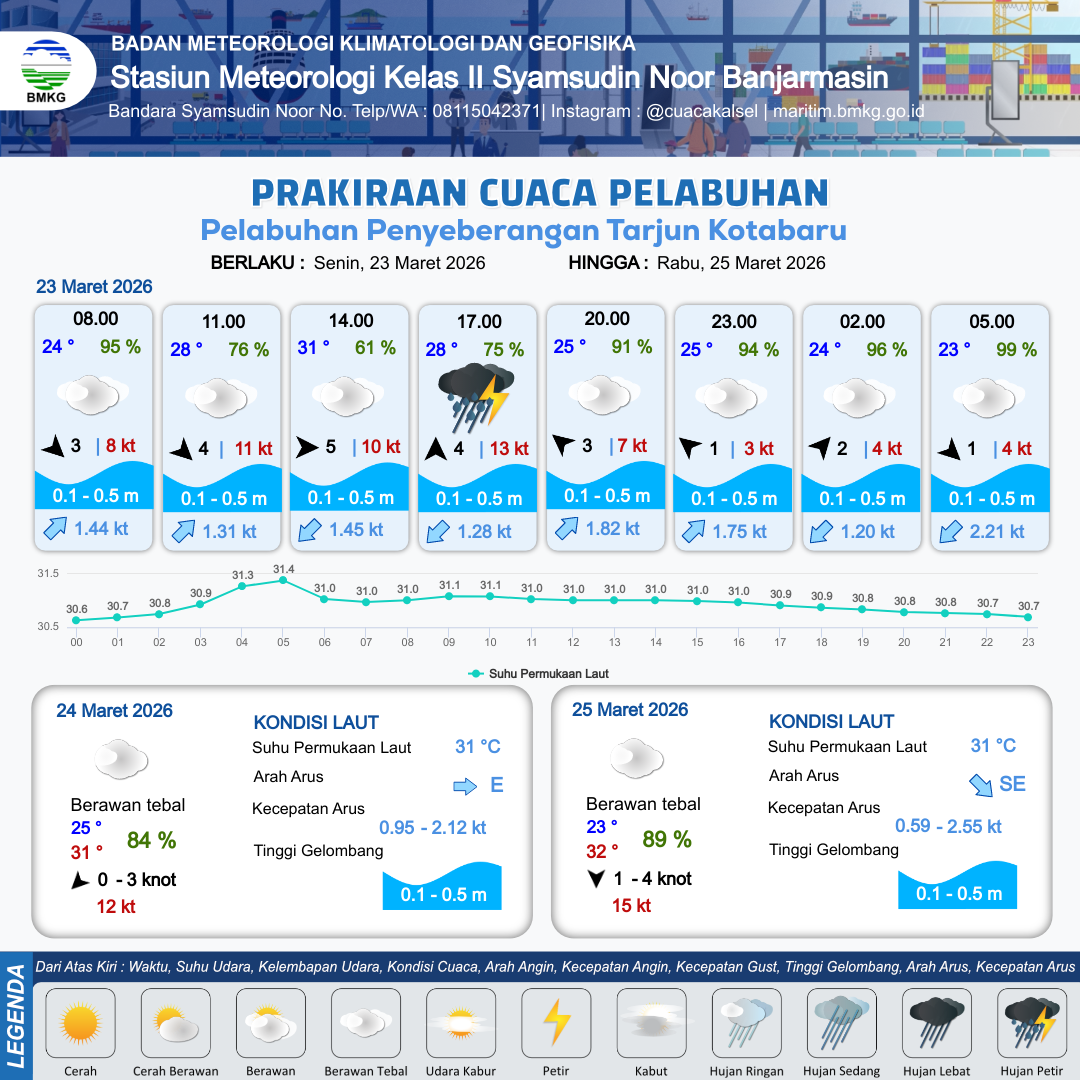 23 Mar 26, 11.00 12 jam kedepan | Tenggara 3 kt Gust Peningkatan kecepatan angin yang singkat dan tiba-tiba : 9 kt | 0.1 m Tenang | Timur Laut 1.0 Knot | 9 km | 26 °C | 89 % | +1.00 m | |