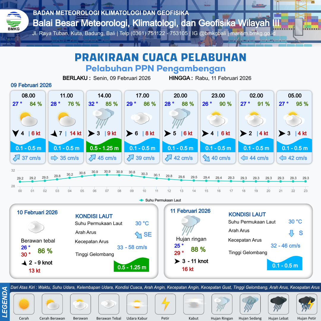 8 Feb 26, 21.00 2 jam kedepan | Berawan | Barat 10 kt Gust Peningkatan kecepatan angin yang singkat dan tiba-tiba : 5 kt | | | 10 km | 25 °C | 92 % | -0.08 m |
