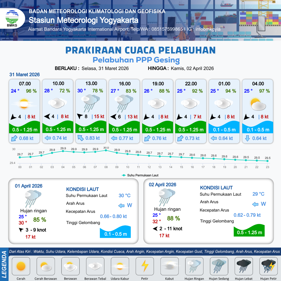 31 Mar 26, 22.00 4 jam kedepan | Cerah Berawan | Timur Laut 4 kt Gust Peningkatan kecepatan angin yang singkat dan tiba-tiba : 7 kt | | | 10 km | 25 °C | 98 % | -0.21 m |