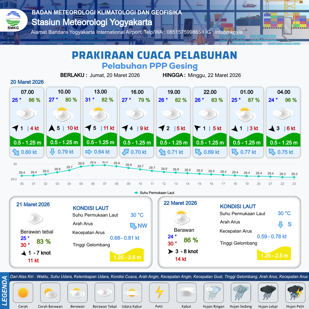 20 Mar 26, 05.00 14 jam yang lalu | Cerah Berawan | Barat Daya 5 kt Gust Peningkatan kecepatan angin yang singkat dan tiba-tiba : 10 kt | | | 10 km | 30 °C | 79 % | +0.04 m |