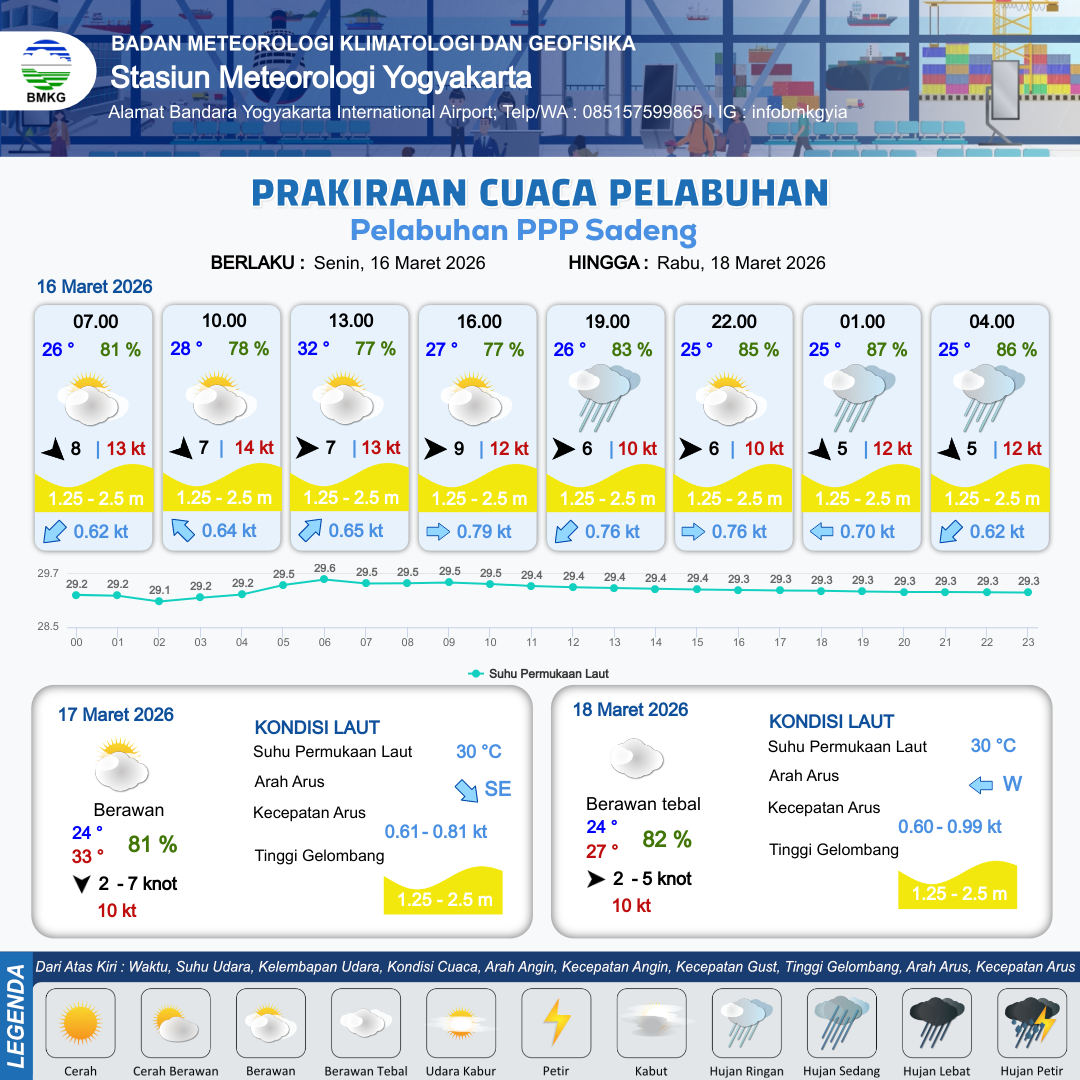 16 Mar 26, 09.00 3 jam kedepan | Barat 9 kt Gust Peningkatan kecepatan angin yang singkat dan tiba-tiba : 12 kt | 2.1 m Sedang | Timur 0.8 Knot | 10 km | 27 °C | 77 % | +0.18 m | |