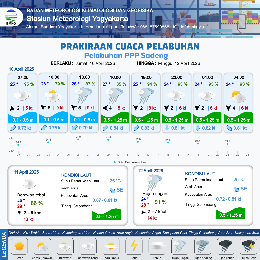 11 Apr 26, 23.00 14 jam kedepan | Timur 3 kt Gust Peningkatan kecepatan angin yang singkat dan tiba-tiba : 11 kt | 0.8 m Rendah | Tenggara 0.8 Knot | 10 km | 25 °C | 92 % | +0.50 m |