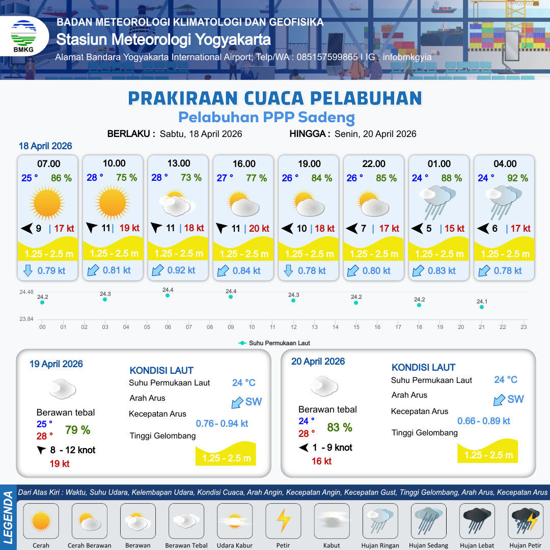 18 Apr 26, 00.00 2 jam kedepan | Timur 9 kt Gust Peningkatan kecepatan angin yang singkat dan tiba-tiba : 17 kt | 1.7 m Sedang | Selatan 0.8 Knot | 10 km | 25 °C | 86 % | +0.41 m | |