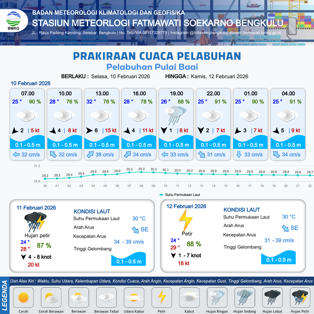 10 Feb 26, 06.00 12 jam yang lalu | Berawan Tebal | Barat 6 kt Gust Peningkatan kecepatan angin yang singkat dan tiba-tiba : 15 kt | | | 10 km | 32 °C | 76 % | +0.13 m |