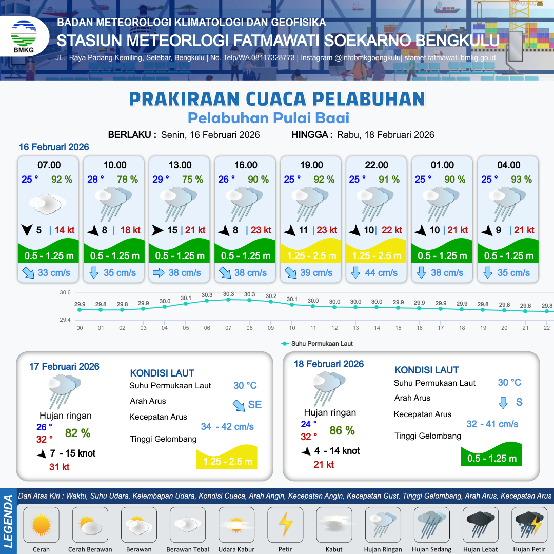 16 Feb 26, 15.00 4 jam kedepan | Barat Laut 10 kt Gust Peningkatan kecepatan angin yang singkat dan tiba-tiba : 22 kt | 1.8 m Sedang | Selatan 44.0 cm/s | 9 km | 25 °C | 91 % | -0.18 m | |