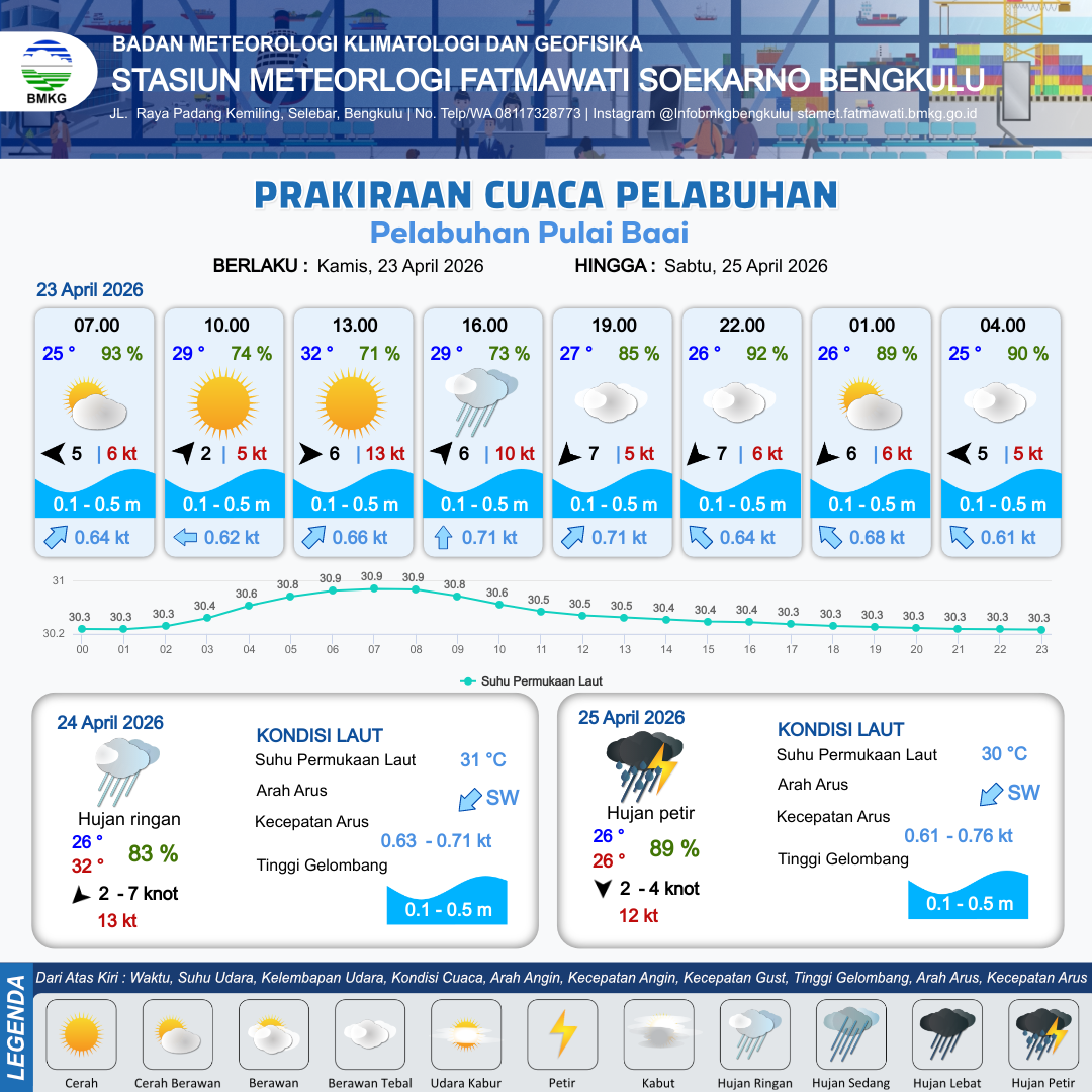 15 Apr 26, 12.00 7 hari yang lalu | Utara 9 kt Gust Peningkatan kecepatan angin yang singkat dan tiba-tiba : 12 kt | 0.7 m Rendah | Tenggara 1.0 Knot | 5 km | 25 °C | 95 % | +0.40 m | |