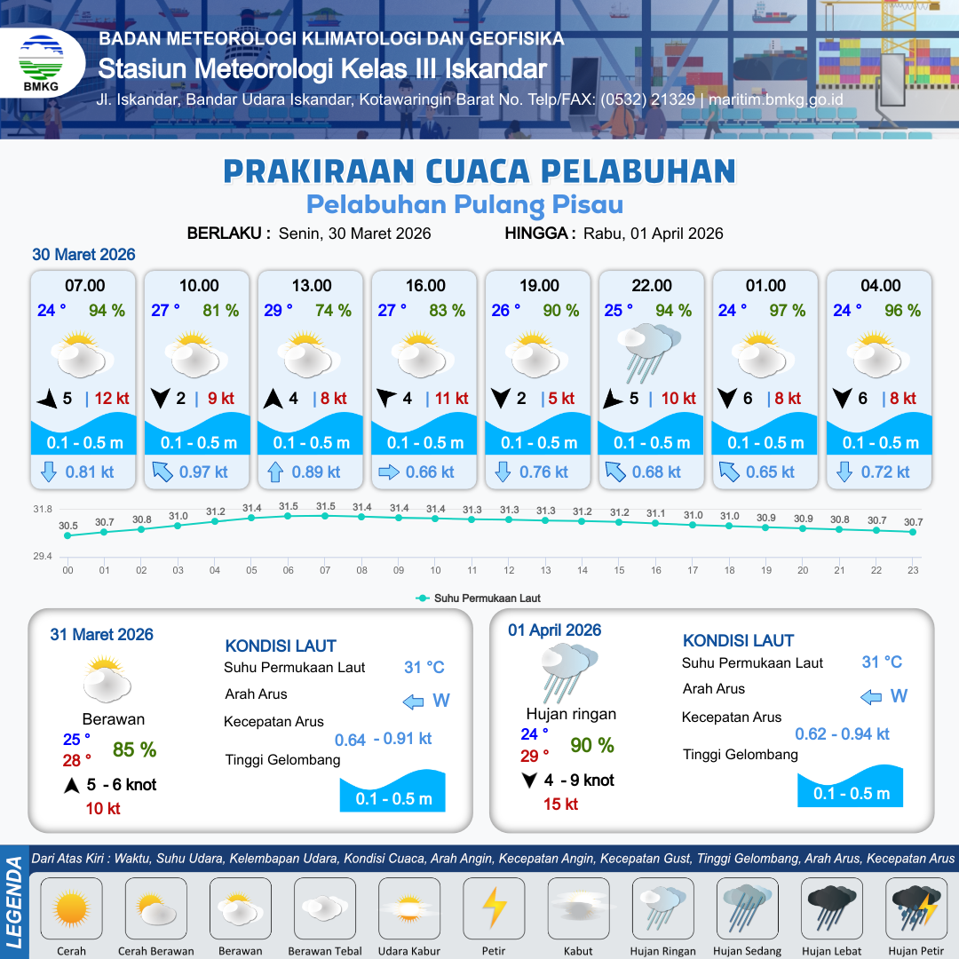 30 Mar 26, 12.00 3 jam kedepan | Utara 2 kt Gust Peningkatan kecepatan angin yang singkat dan tiba-tiba : 5 kt | 0.2 m Tenang | Selatan 0.8 Knot | 10 km | 26 °C | 90 % | +0.22 m | |