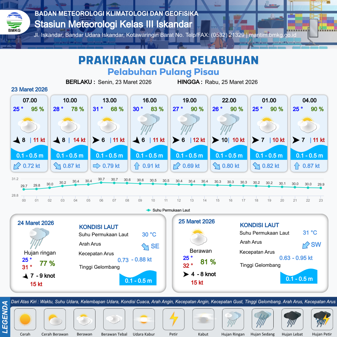23 Mar 26, 09.00 10 jam kedepan | Barat Laut 6 kt Gust Peningkatan kecepatan angin yang singkat dan tiba-tiba : 11 kt | 0.5 m Rendah | Utara 0.9 Knot | 4 km | 30 °C | 83 % | -0.11 m | |