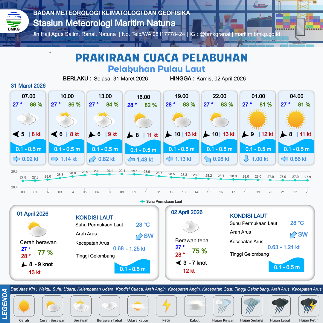 1 Apr 26, 14.00 16 jam kedepan | Timur Laut 9 kt Gust Peningkatan kecepatan angin yang singkat dan tiba-tiba : 12 kt | 0.2 m Tenang | Selatan 0.8 Knot | 10 km | 28 °C | 71 % | +0.11 m | |