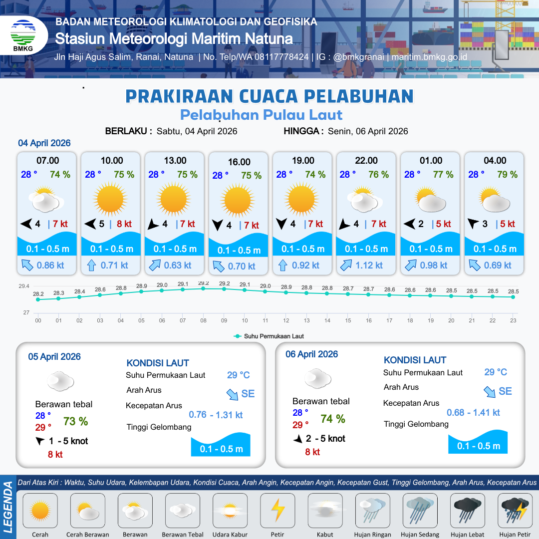 4 Apr 26, 23.00 2 jam kedepan | Cerah Berawan | Tenggara 5 kt Gust Peningkatan kecepatan angin yang singkat dan tiba-tiba : 6 kt | | | 10 km | 28 °C | 78 % | +0.67 m |