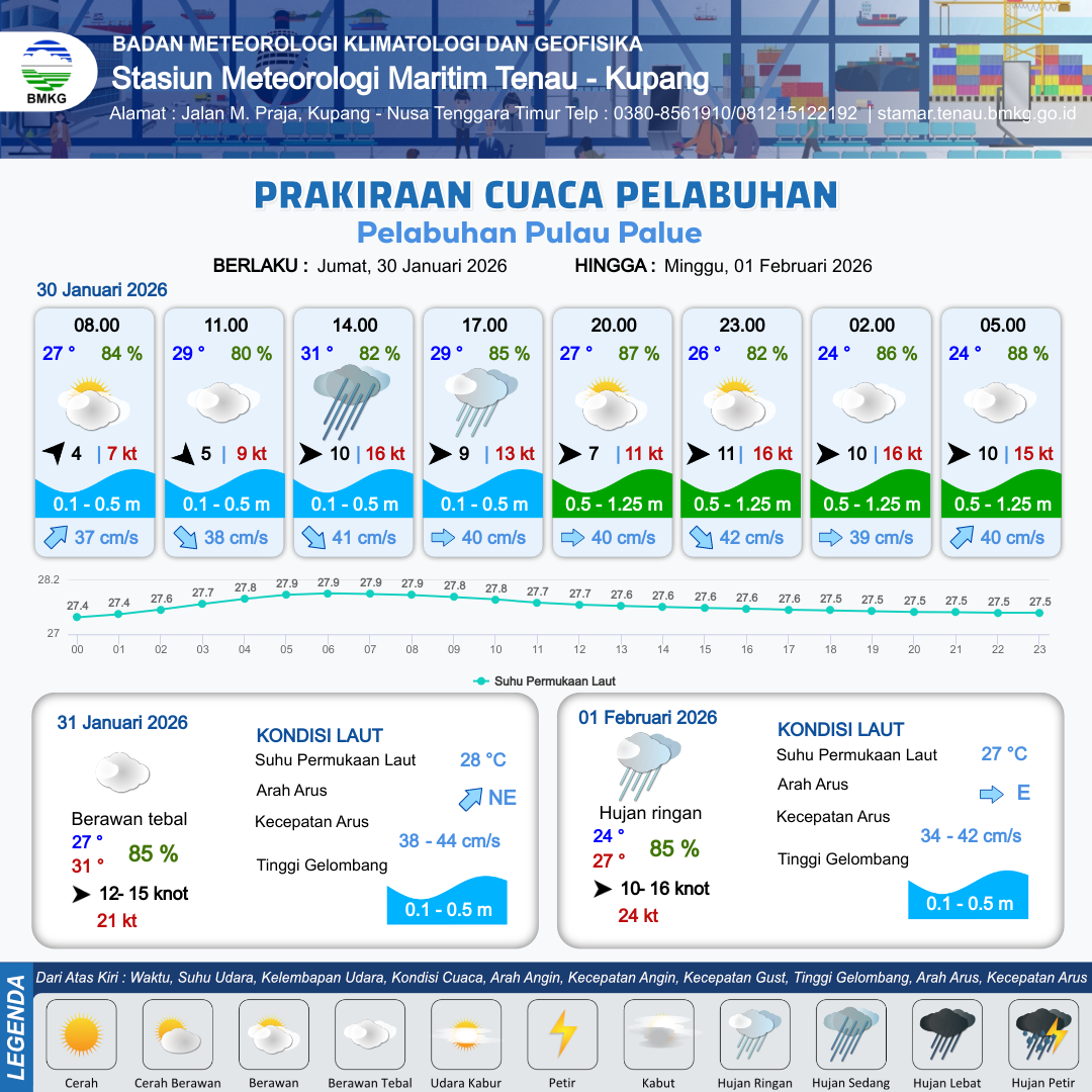 30 Jan 26, 23.00 16 jam kedepan | Barat 12 kt Gust Peningkatan kecepatan angin yang singkat dan tiba-tiba : 17 kt | 0.6 m Rendah | Timur Laut 39.0 cm/s | 8 km | 27 °C | 85 % | -0.93 m |