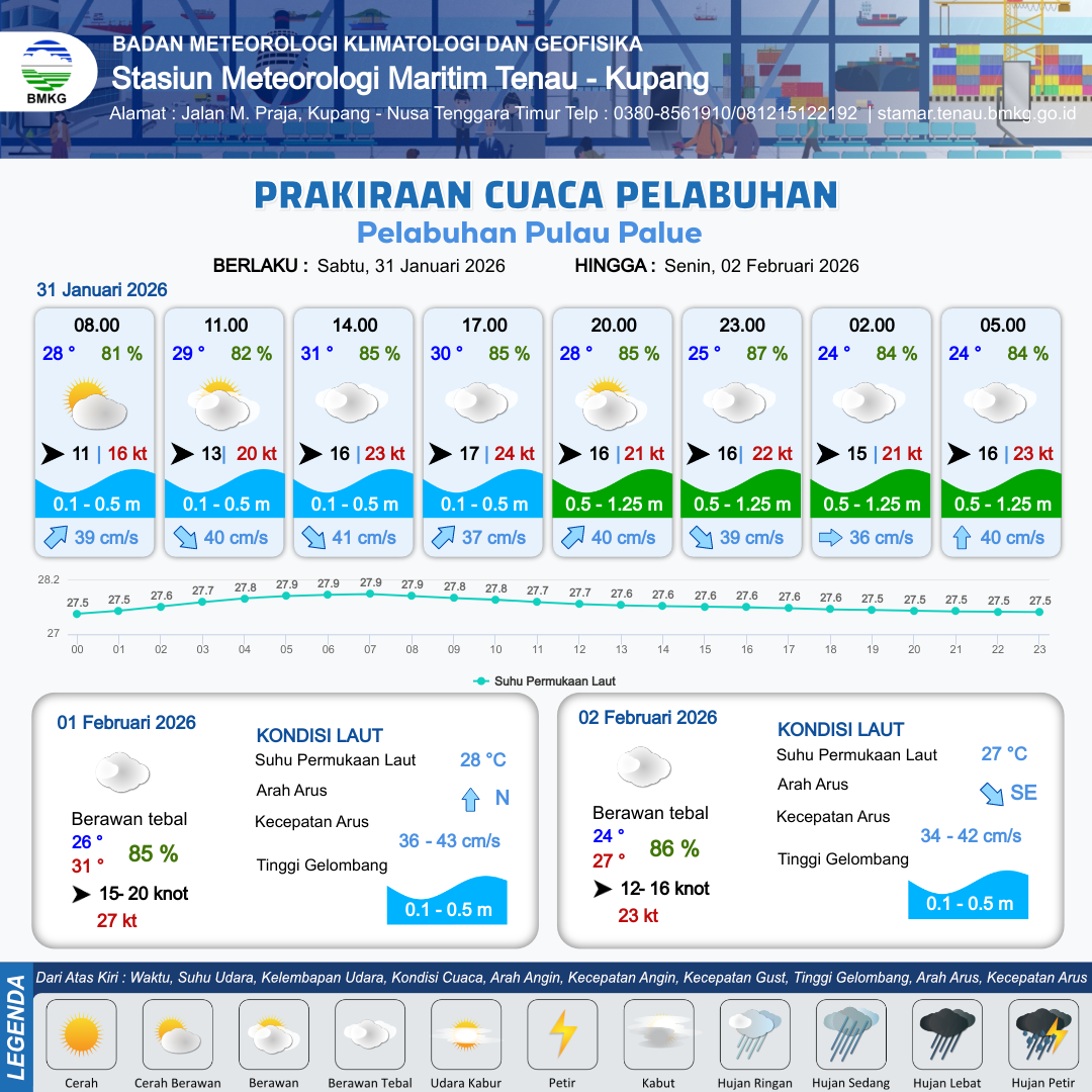 31 Jan 26, 08.00 6 jam kedepan | Barat 17 kt Gust Peningkatan kecepatan angin yang singkat dan tiba-tiba : 23 kt | 0.1 m Tenang | Timur 37.0 cm/s | 10 km | 31 °C | 82 % | -0.01 m | |