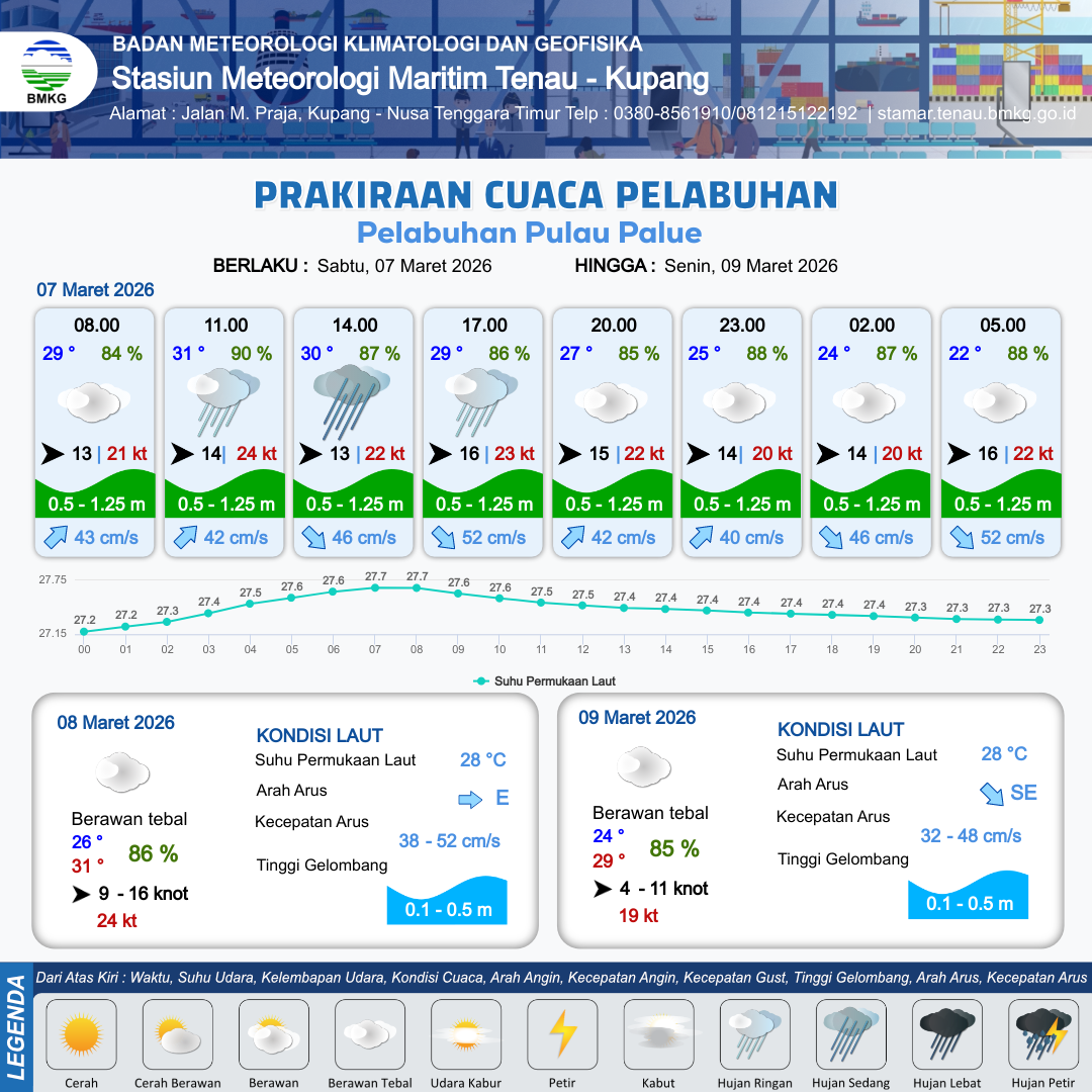 7 Mar 26, 23.00 9 jam kedepan | Barat 16 kt Gust Peningkatan kecepatan angin yang singkat dan tiba-tiba : 20 kt | 0.9 m Rendah | Timur 42.0 cm/s | 10 km | 27 °C | 86 % | -0.02 m |
