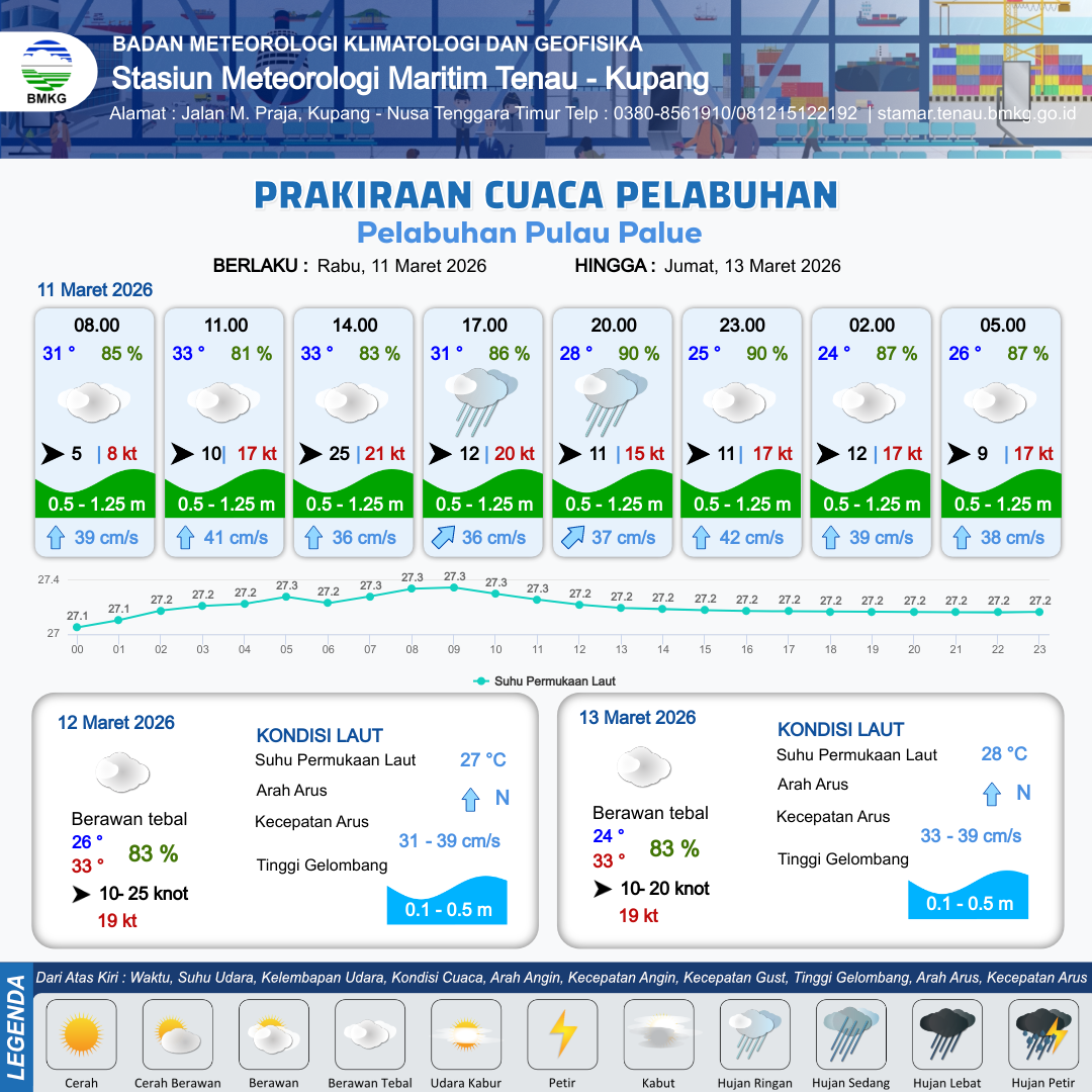10 Mar 26, 17.00 3 jam kedepan | Barat 5 kt Gust Peningkatan kecepatan angin yang singkat dan tiba-tiba : 11 kt | 0.1 m Tenang | Utara 39.0 cm/s | 8 km | 26 °C | 88 % | -0.65 m | |
