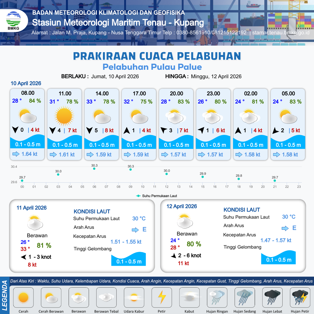 10 Apr 26, 16.00 5 jam kedepan | Barat Daya 1 kt Gust Peningkatan kecepatan angin yang singkat dan tiba-tiba : 4 kt | 0.3 m Tenang | Timur 1.6 Knot | 8 km | 26 °C | 80 % | +0.57 m | |