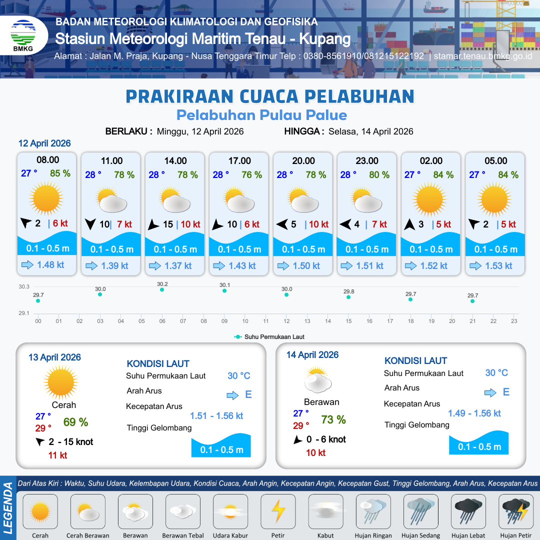 12 Apr 26, 21.00 11 jam kedepan | Tenggara 2 kt Gust Peningkatan kecepatan angin yang singkat dan tiba-tiba : 5 kt | 0.3 m Tenang | Timur 1.5 Knot | 8 km | 27 °C | 84 % | +0.59 m | |