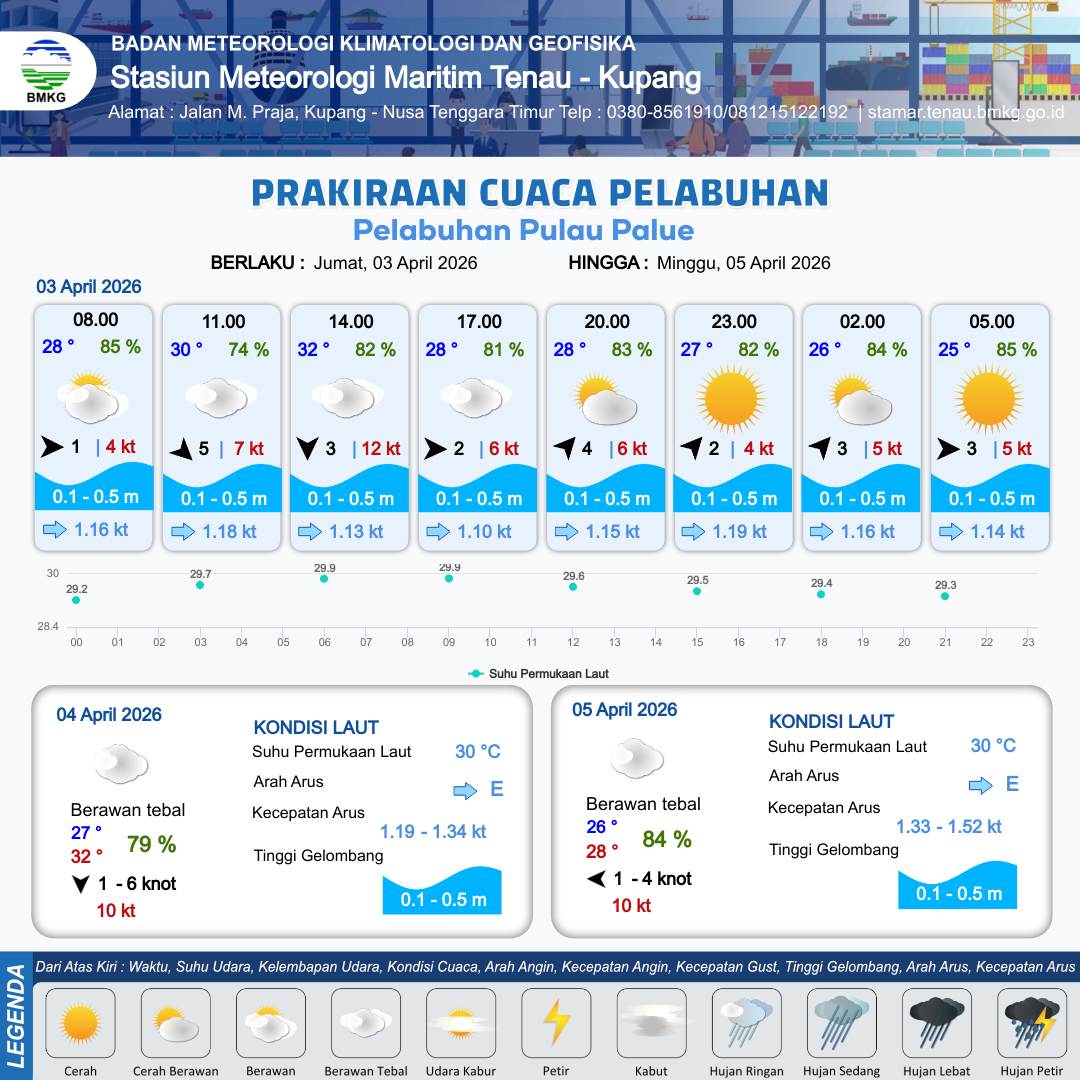 3 Apr 26, 09.00 2 jam kedepan | Barat 2 kt Gust Peningkatan kecepatan angin yang singkat dan tiba-tiba : 6 kt | 0.3 m Tenang | Timur 1.1 Knot | 10 km | 28 °C | 81 % | +0.60 m | |