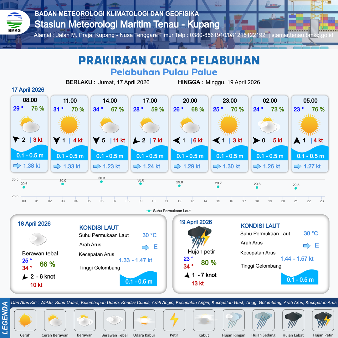 17 Apr 26, 07.00 8 jam kedepan | Utara 5 kt Gust Peningkatan kecepatan angin yang singkat dan tiba-tiba : 10 kt | 0.3 m Tenang | Timur 1.2 Knot | 10 km | 32 °C | 63 % | +0.57 m | |