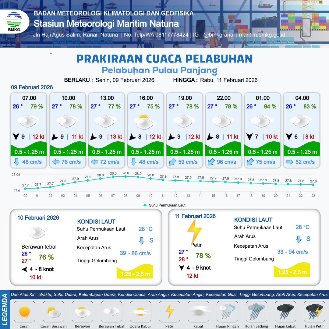 9 Feb 26, 13.00 2 jam kedepan | Timur Laut 9 kt Gust Peningkatan kecepatan angin yang singkat dan tiba-tiba : 12 kt | 1.1 m Rendah | Barat Daya 71.0 cm/s | 10 km | 27 °C | 78 % | +0.94 m | |