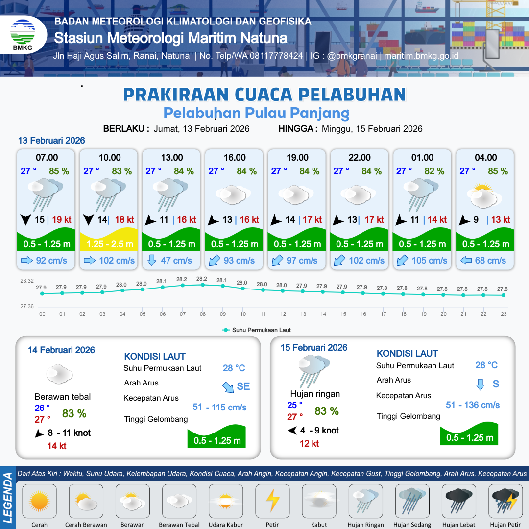 13 Feb 26, 22.00 9 jam kedepan | Timur Laut 9 kt Gust Peningkatan kecepatan angin yang singkat dan tiba-tiba : 12 kt | 1.1 m Rendah | Barat 46.0 cm/s | 10 km | 27 °C | 86 % | -0.42 m | |
