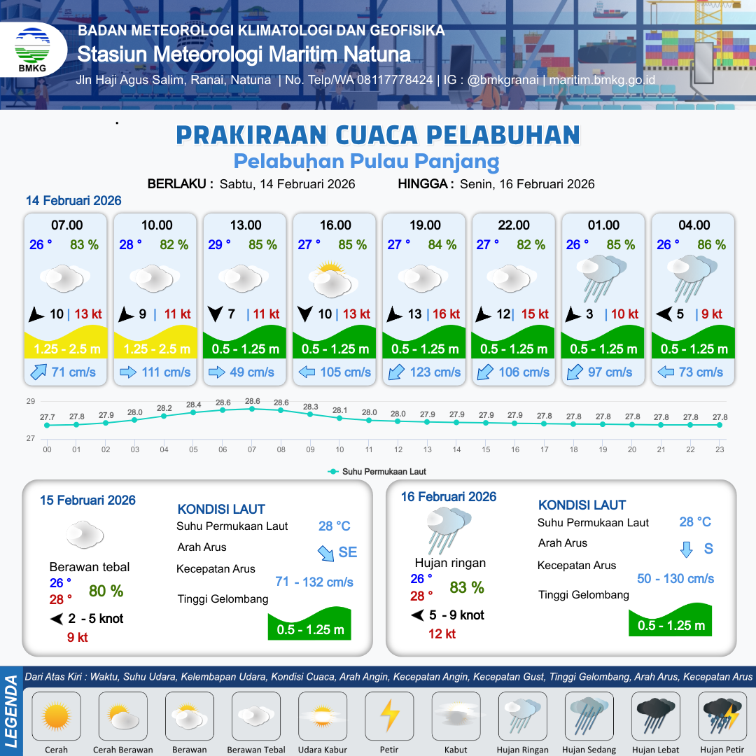 14 Feb 26, 13.00 Saat ini | Timur Laut 13 kt Gust Peningkatan kecepatan angin yang singkat dan tiba-tiba : 18 kt | 0.9 m Rendah | Barat Daya 118.0 cm/s | 10 km | 27 °C | 84 % | +0.17 m | |
