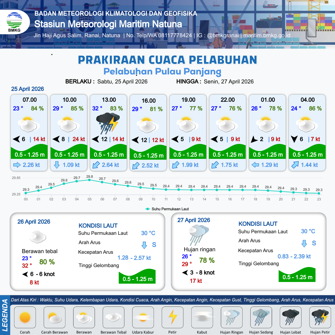 24 Apr 26, 09.00 2 jam kedepan | Timur Laut 9 kt Gust Peningkatan kecepatan angin yang singkat dan tiba-tiba : 13 kt | 0.6 m Rendah | Barat Daya 2.4 Knot | 10 km | 27 °C | 86 % | +0.03 m | |
