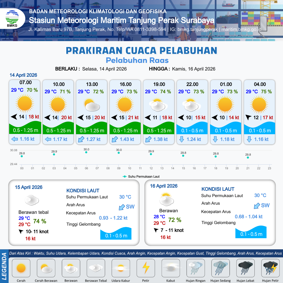 14 Apr 26, 23.00 9 jam kedepan | Tenggara 11 kt Gust Peningkatan kecepatan angin yang singkat dan tiba-tiba : 18 kt | 0.4 m Tenang | Barat Daya 1.0 Knot | 10 km | 29 °C | 76 % | +0.58 m |