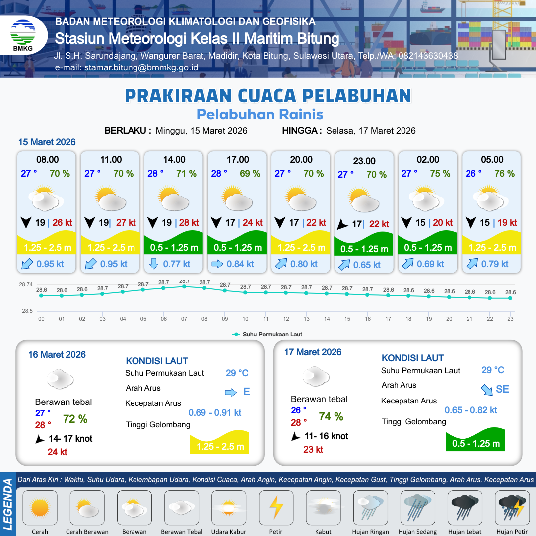 15 Mar 26, 07.00 12 jam yang lalu | Cerah Berawan | Utara 19 kt Gust Peningkatan kecepatan angin yang singkat dan tiba-tiba : 27 kt | | | 9 km | 28 °C | 69 % | +0.25 m |