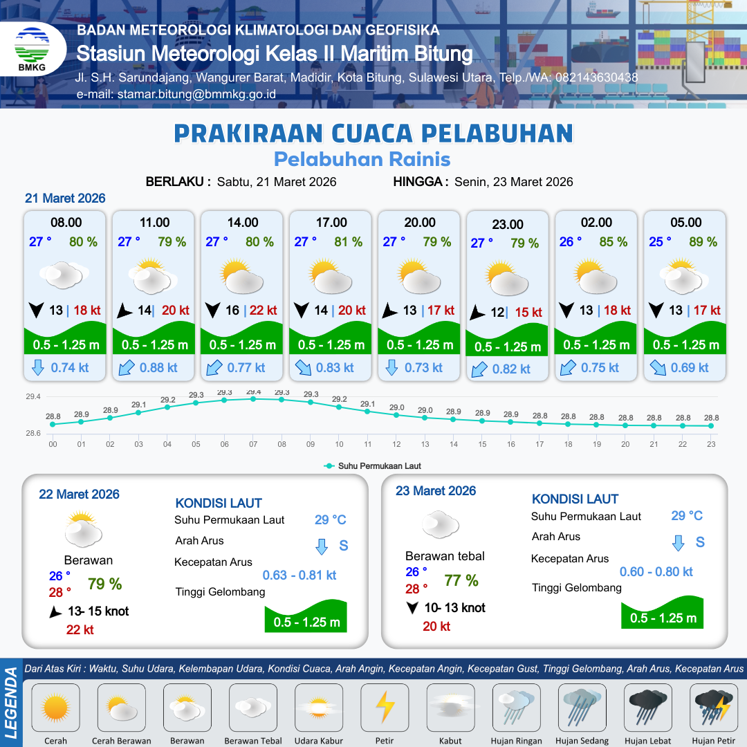 21 Mar 26, 19.00 19 jam kedepan | Utara 13 kt Gust Peningkatan kecepatan angin yang singkat dan tiba-tiba : 18 kt | 1.1 m Rendah | Barat Daya 0.7 Knot | 10 km | 25 °C | 89 % | -0.62 m | |