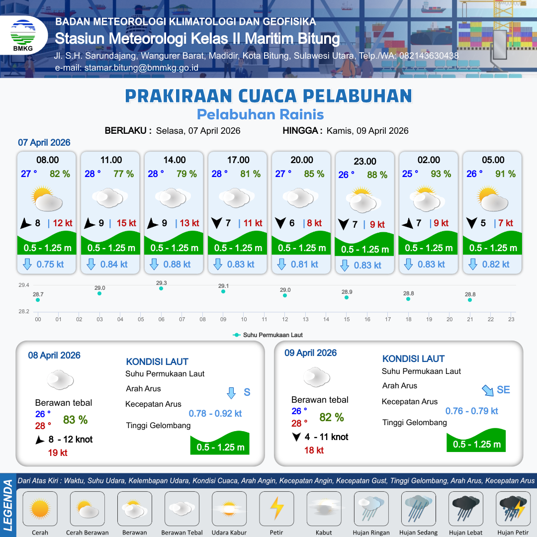 7 Apr 26, 06.00 2 jam kedepan | Timur Laut 9 kt Gust Peningkatan kecepatan angin yang singkat dan tiba-tiba : 13 kt | 0.9 m Rendah | Selatan 0.9 Knot | 10 km | 28 °C | 79 % | +0.53 m | |