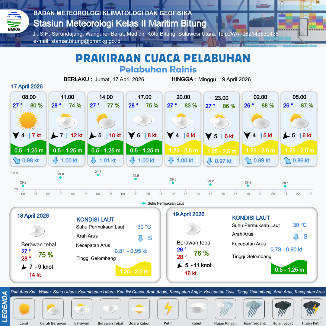17 Apr 26, 11.00 3 jam kedepan | Utara 4 kt Gust Peningkatan kecepatan angin yang singkat dan tiba-tiba : 6 kt | 1.3 m Sedang | Selatan 1.0 Knot | 10 km | 27 °C | 79 % | +0.54 m | |