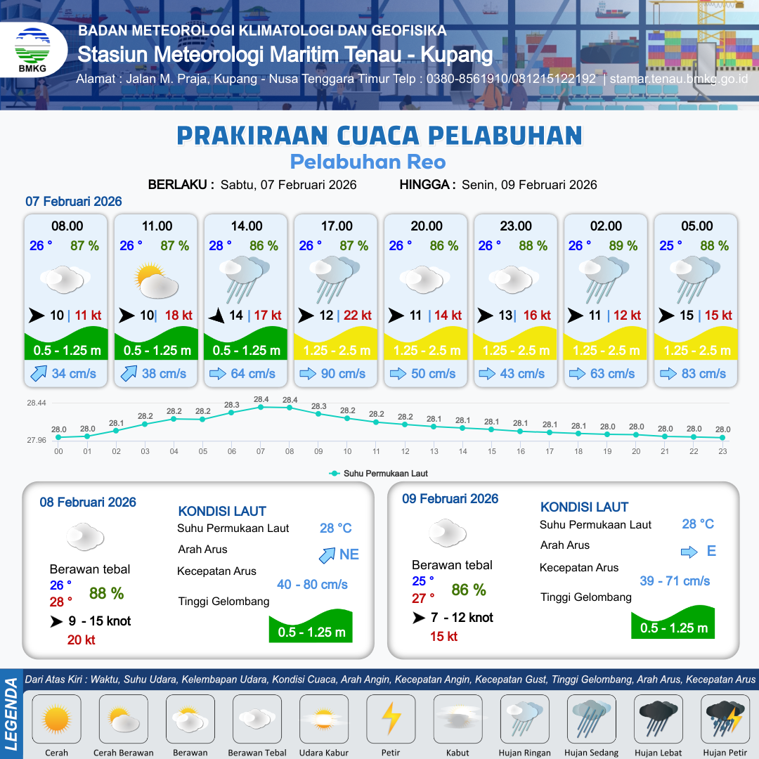 7 Feb 26, 22.00 5 jam kedepan | Berawan Tebal | Barat 15 kt Gust Peningkatan kecepatan angin yang singkat dan tiba-tiba : 17 kt | | | 6 km | 25 °C | 90 % | +0.36 m |