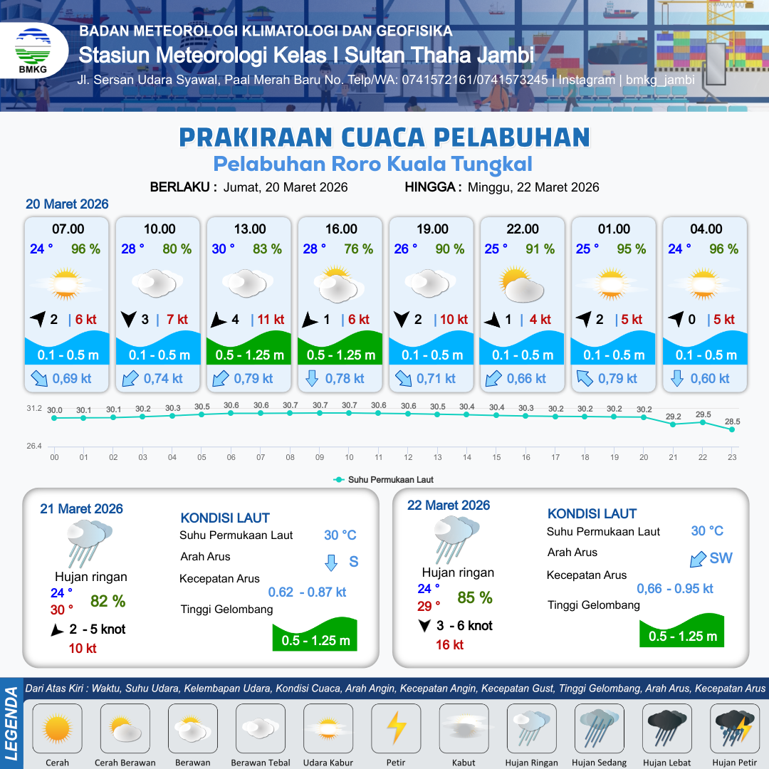 20 Mar 26, 16.00 2 jam yang lalu | Cerah Berawan | Barat Laut 1 kt Gust Peningkatan kecepatan angin yang singkat dan tiba-tiba : 4 kt | | | 10 km | 25 °C | 92 % | -1.45 m |
