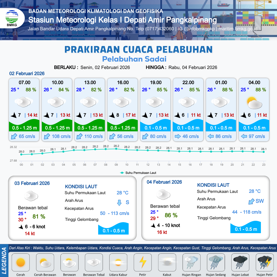 2 Feb 26, 22.00 3 jam kedepan | Cerah Berawan | Barat Laut 6 kt Gust Peningkatan kecepatan angin yang singkat dan tiba-tiba : 12 kt | | | 10 km | 25 °C | 89 % | +0.82 m |