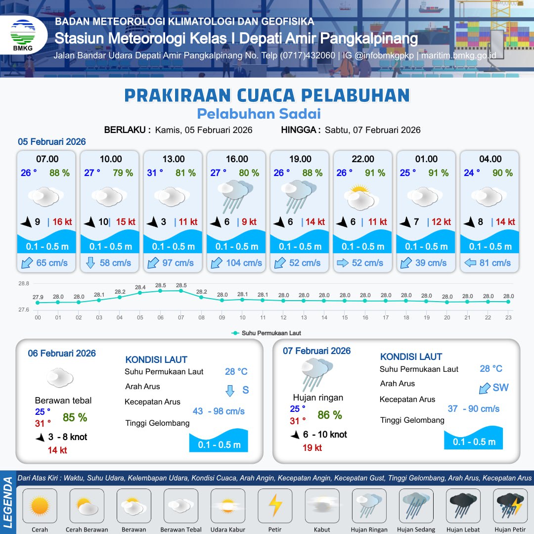 5 Feb 26, 15.00 5 jam yang lalu | Berawan | Barat Laut 6 kt Gust Peningkatan kecepatan angin yang singkat dan tiba-tiba : 11 kt | | | 7 km | 26 °C | 91 % | -0.47 m |