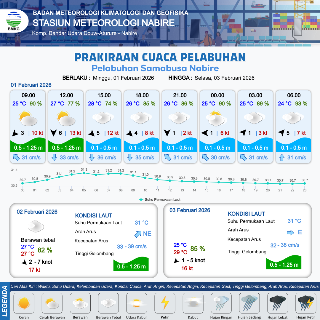 1 Feb 26, 22.00 2 jam kedepan | Cerah | Barat Daya 5 kt Gust Peningkatan kecepatan angin yang singkat dan tiba-tiba : 8 kt | | | km | 25 °C | 92 % | +0.89 m |