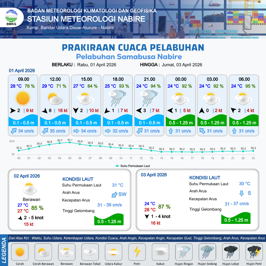 1 Apr 26, 03.00 15 jam yang lalu | Cerah Berawan | Barat Laut 6 kt Gust Peningkatan kecepatan angin yang singkat dan tiba-tiba : 18 kt | | | 10 km | 29 °C | 71 % | -0.81 m |