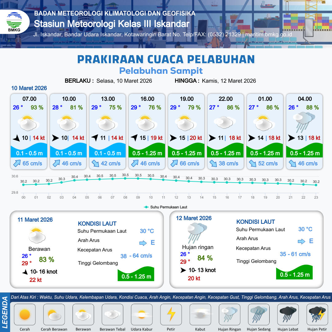10 Mar 26, 06.00 12 jam yang lalu | Berawan | Barat Daya 11 kt Gust Peningkatan kecepatan angin yang singkat dan tiba-tiba : 14 kt | | | 10 km | 29 °C | 75 % | +0.51 m |