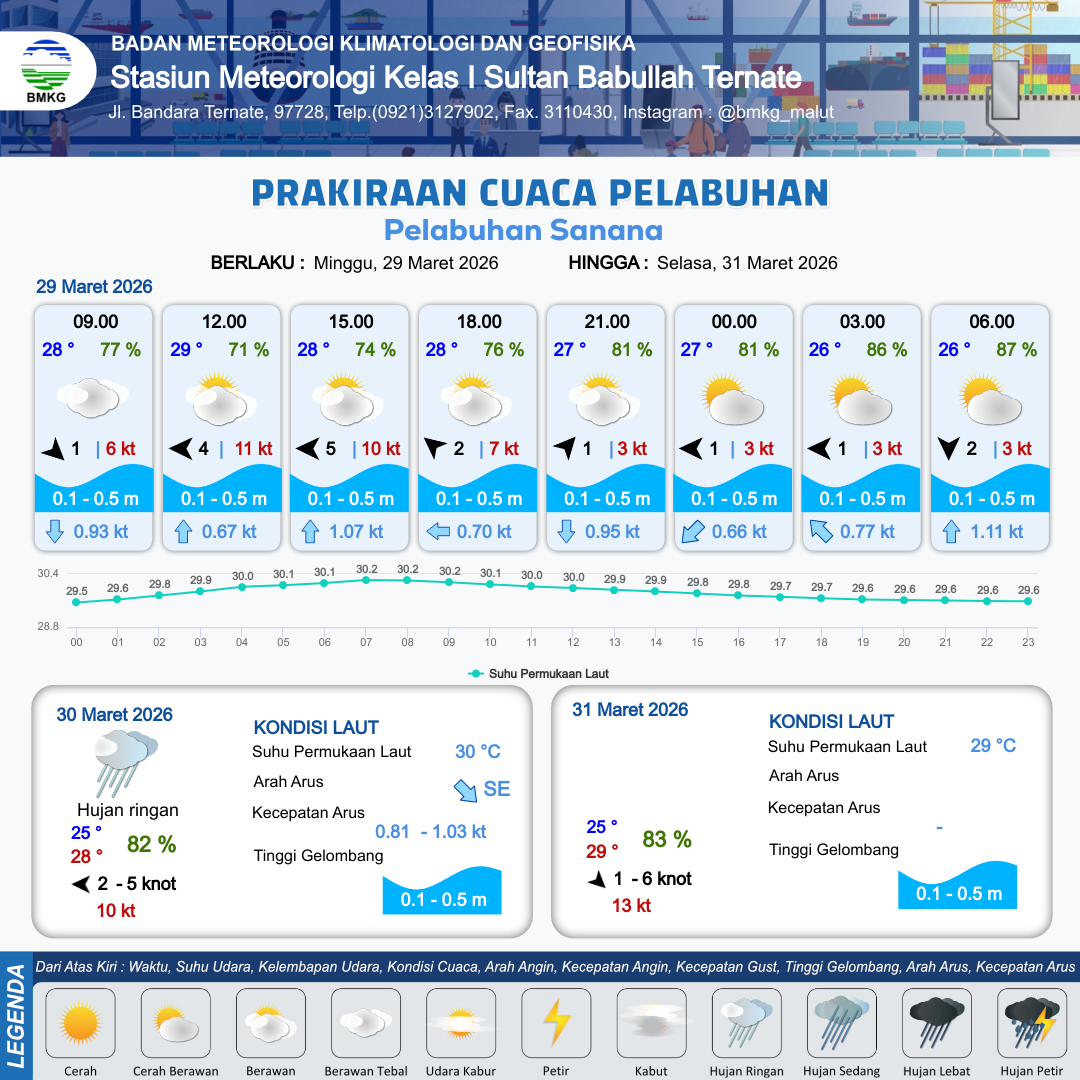 29 Mar 26, 18.00 12 jam kedepan | Timur 1 kt Gust Peningkatan kecepatan angin yang singkat dan tiba-tiba : 3 kt | 0.1 m Tenang | Barat Laut 0.8 Knot | 10 km | 26 °C | 86 % | -0.17 m | |