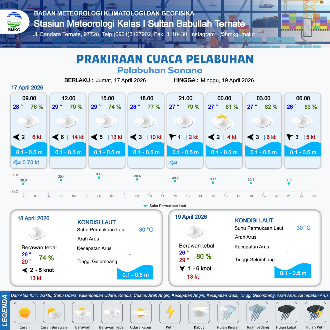 17 Apr 26, 16.00 4 jam kedepan | Timur 2 kt Gust Peningkatan kecepatan angin yang singkat dan tiba-tiba : 5 kt | 0.3 m Tenang | - Knot | 10 km | 27 °C | 81 % | - m | |
