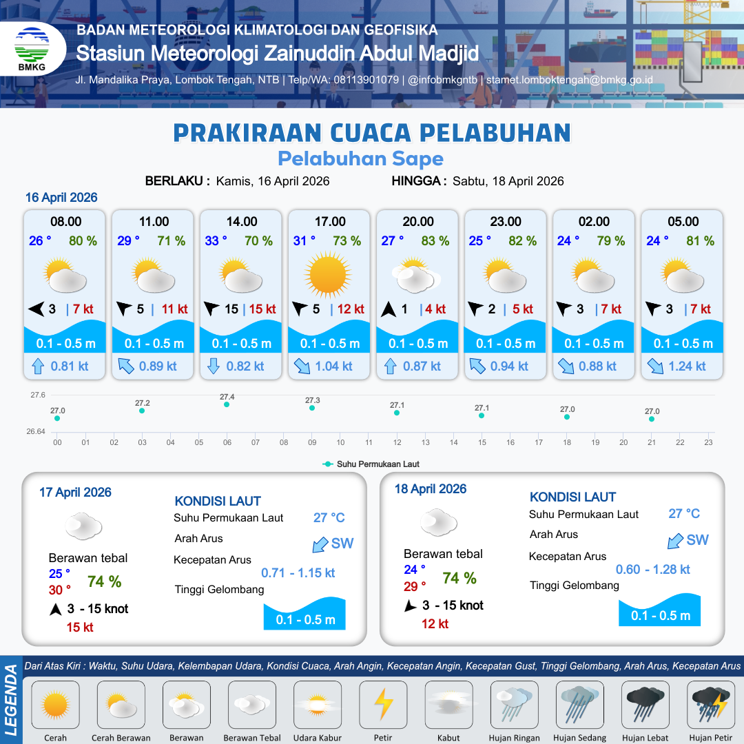 15 Apr 26, 23.00 3 jam kedepan | Cerah | Timur 1 kt Gust Peningkatan kecepatan angin yang singkat dan tiba-tiba : 6 kt | | | 7 km | 26 °C | 83 % | +0.50 m |