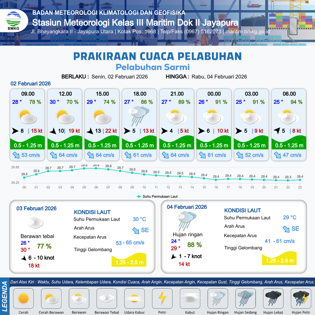2 Feb 26, 23.00 4 jam kedepan | Berawan | Barat 6 kt Gust Peningkatan kecepatan angin yang singkat dan tiba-tiba : 9 kt | | | 10 km | 27 °C | 88 % | +0.40 m |