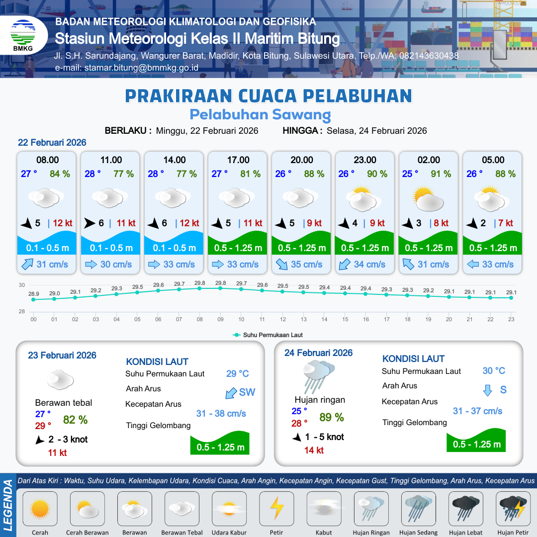 22 Feb 26, 07.00 12 jam yang lalu | Berawan Tebal | Barat Laut 6 kt Gust Peningkatan kecepatan angin yang singkat dan tiba-tiba : 12 kt | | | 10 km | 28 °C | 78 % | -0.55 m |