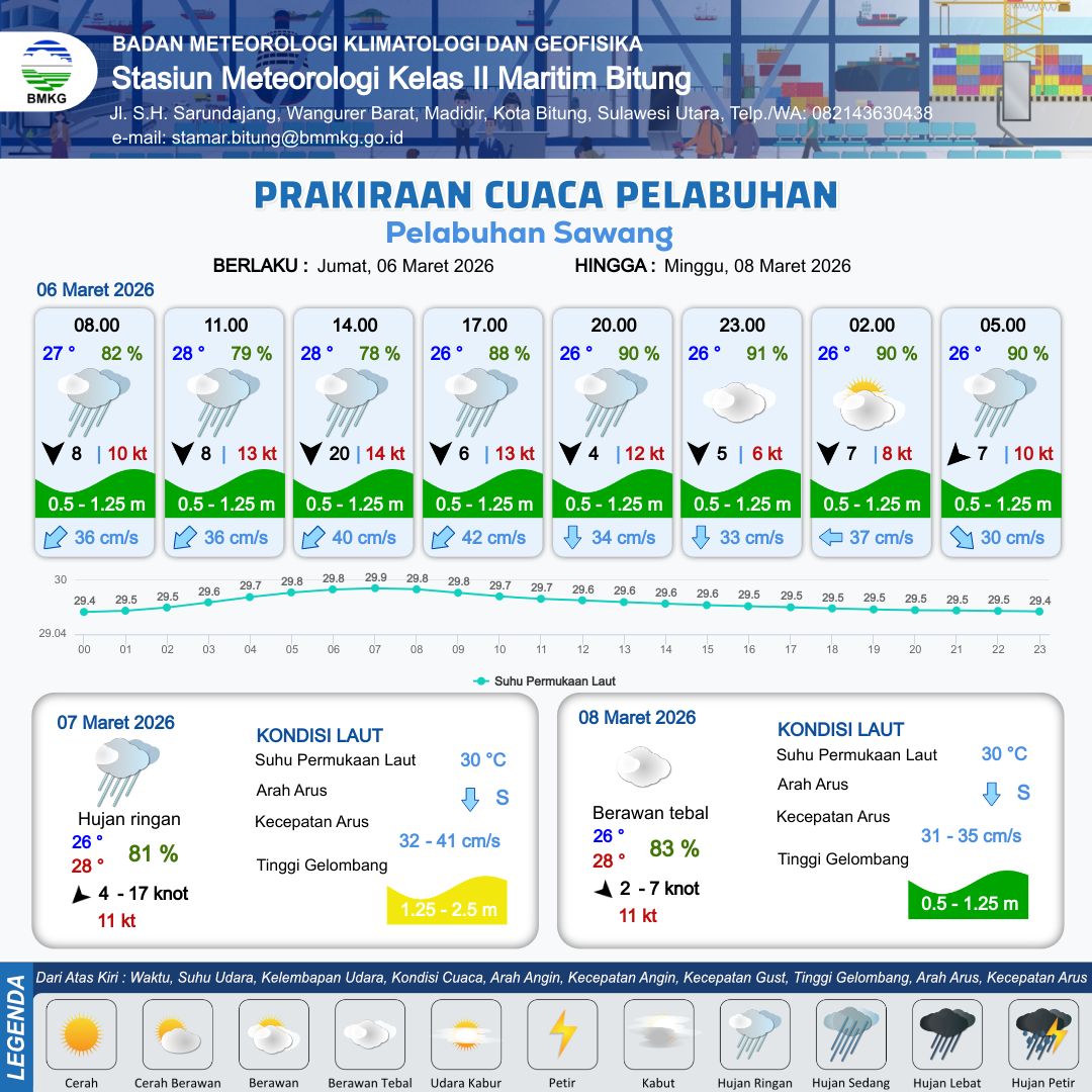 5 Mar 26, 23.00 3 jam kedepan | Berawan Tebal | Utara 4 kt Gust Peningkatan kecepatan angin yang singkat dan tiba-tiba : 8 kt | | | 10 km | 27 °C | 84 % | +0.58 m |