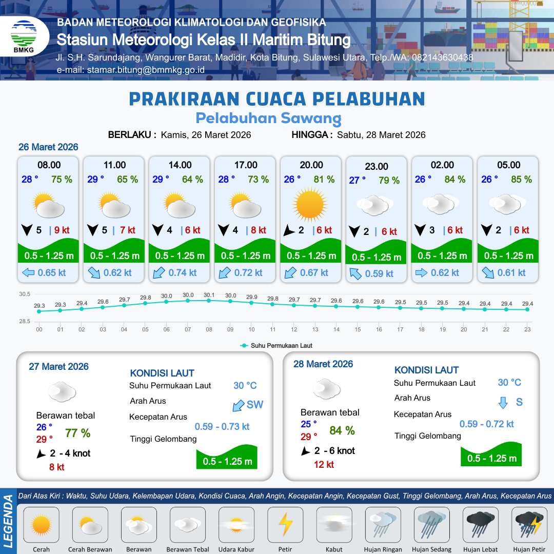 26 Mar 26, 08.00 2 jam kedepan | Utara 4 kt Gust Peningkatan kecepatan angin yang singkat dan tiba-tiba : 8 kt | 0.6 m Rendah | Barat Daya 0.8 Knot | 9 km | 29 °C | 69 % | -0.19 m | |