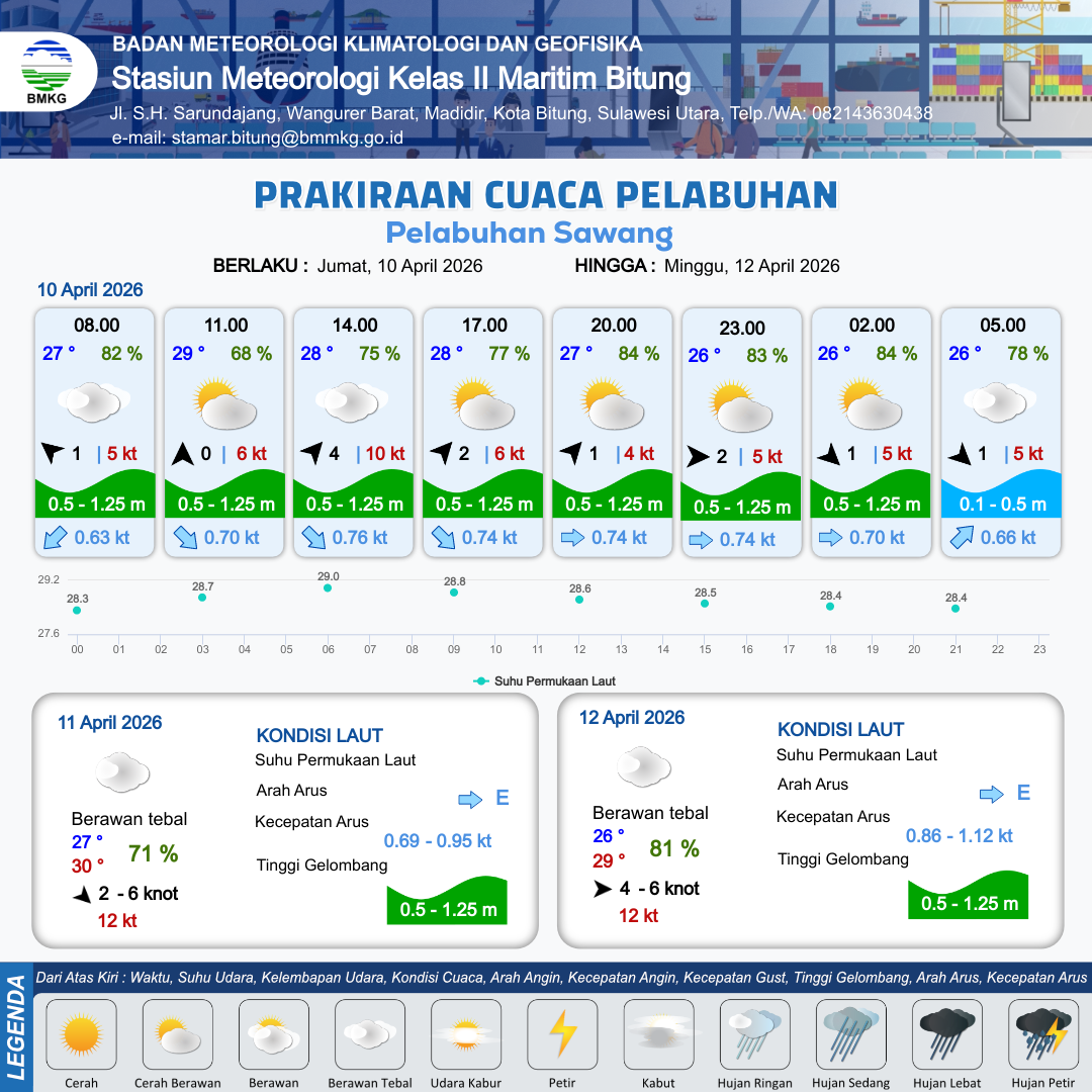 10 Apr 26, 22.00 20 jam kedepan | Barat Laut 1 kt Gust Peningkatan kecepatan angin yang singkat dan tiba-tiba : 5 kt | 0.5 m Rendah | Timur Laut 0.7 Knot | 10 km | 27 °C | 75 % | +0.63 m | |