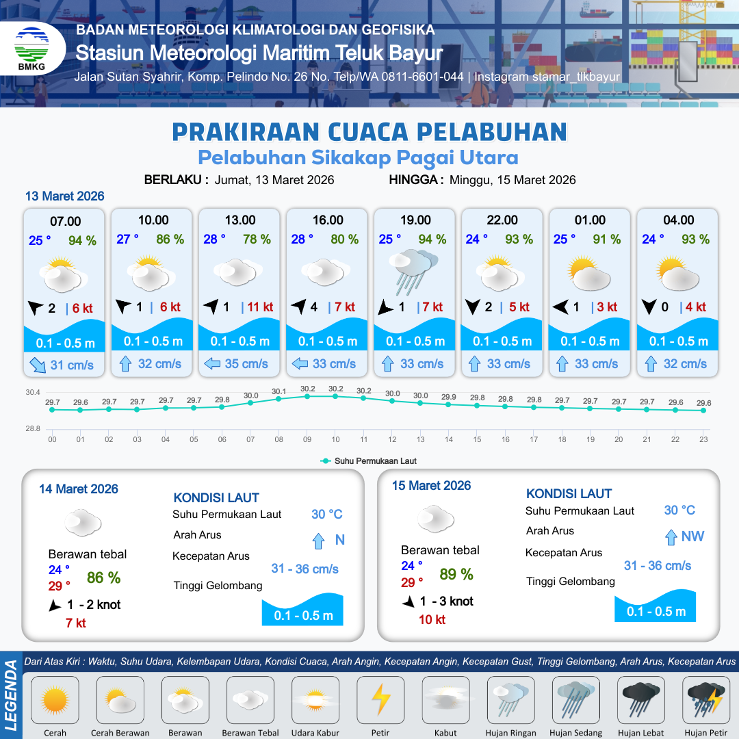 13 Mar 26, 23.00 10 jam kedepan | Selatan 1 kt Gust Peningkatan kecepatan angin yang singkat dan tiba-tiba : 5 kt | 0.1 m Tenang | Utara 31.0 cm/s | 10 km | 24 °C | 93 % | -0.15 m |