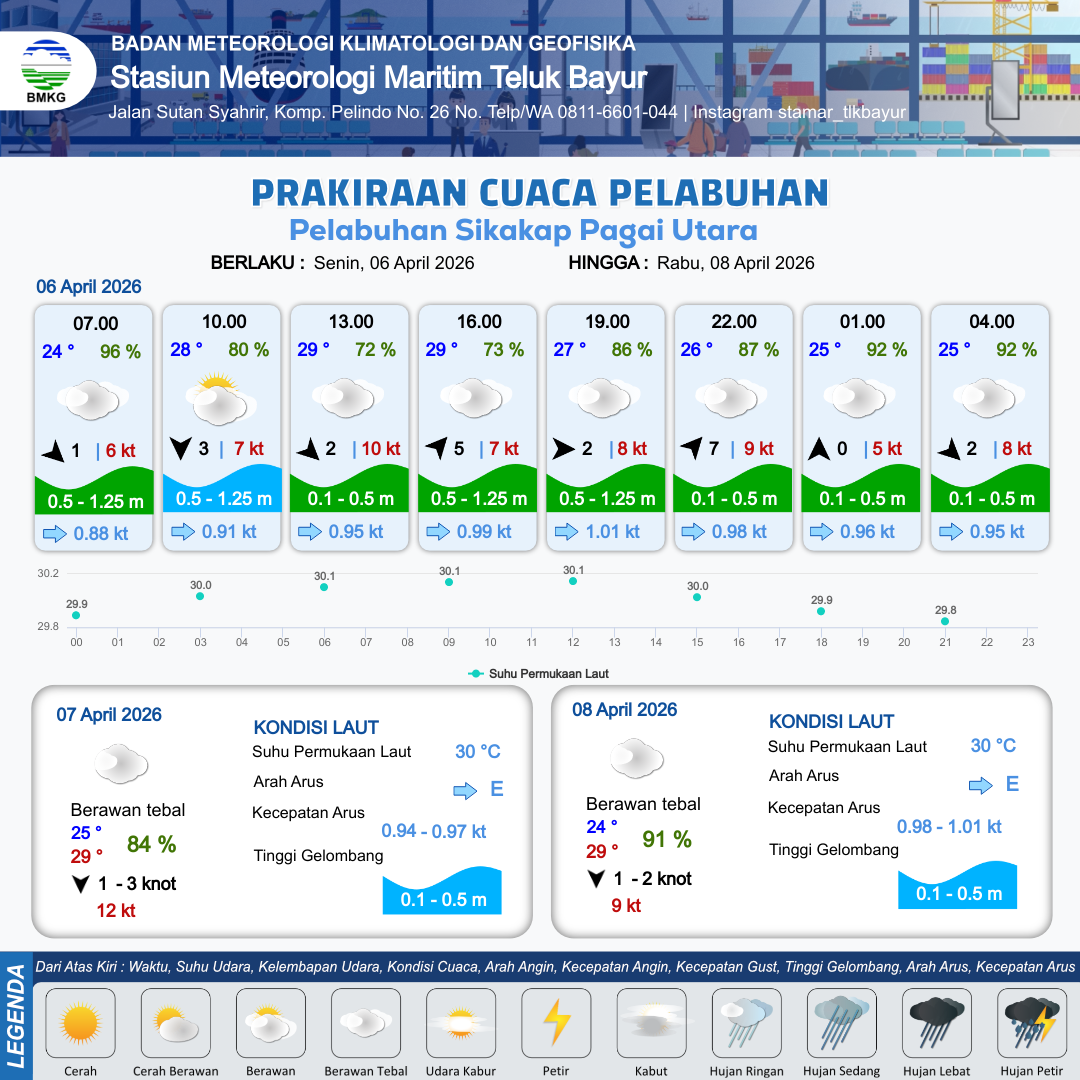 6 Apr 26, 11.00 12 jam kedepan | Barat 2 kt Gust Peningkatan kecepatan angin yang singkat dan tiba-tiba : 8 kt | 0.6 m Rendah | Timur 1.0 Knot | 8 km | 28 °C | 81 % | +0.50 m | |