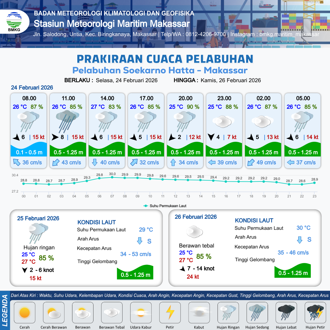24 Feb 26, 06.00 12 jam yang lalu | Hujan Ringan | Barat Laut 6 kt Gust Peningkatan kecepatan angin yang singkat dan tiba-tiba : 15 kt | | | 7 km | 27 °C | 83 % | -0.03 m |
