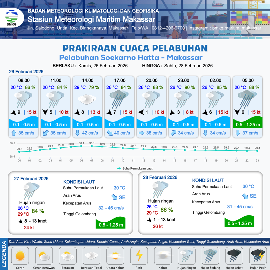 25 Feb 26, 10.00 10 jam yang lalu | Hujan Ringan | Barat 8 kt Gust Peningkatan kecepatan angin yang singkat dan tiba-tiba : 13 kt | | | 6 km | 27 °C | 83 % | +0.71 m |